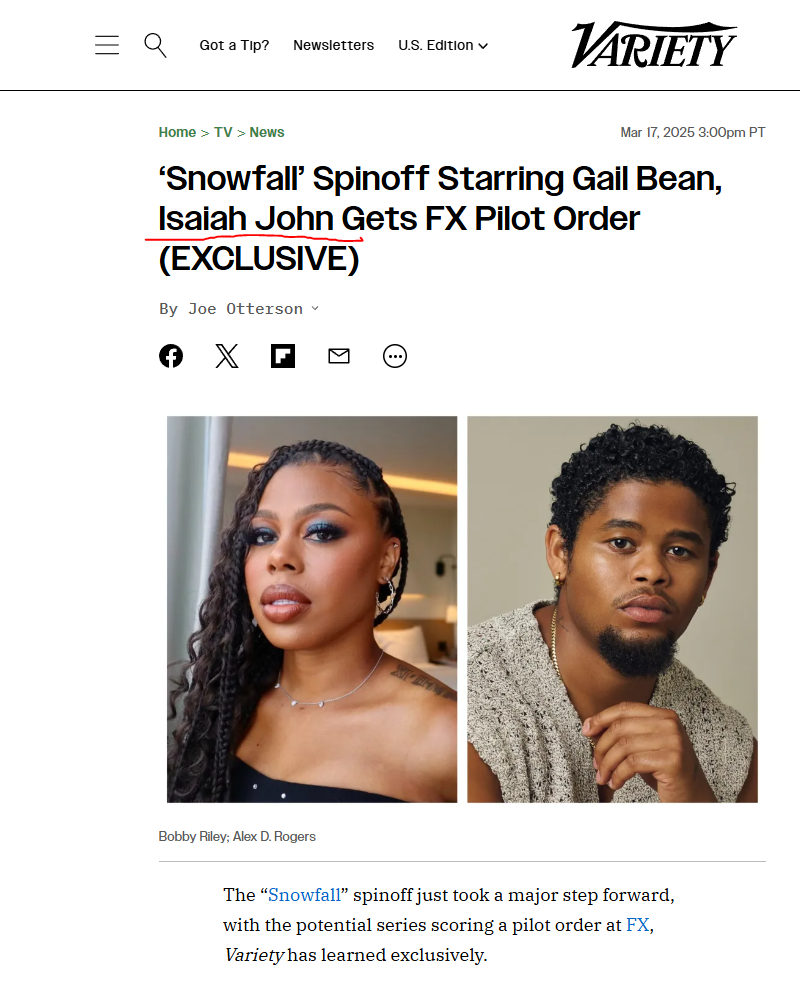 Isaiah John — lead actor in FX’s Snowfall, later secured the spinoff contract after our work.